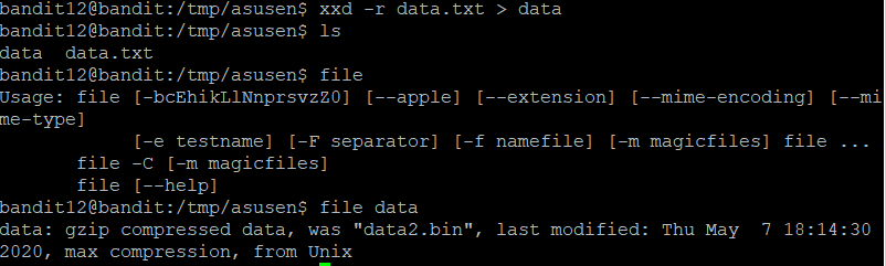 The password for the next level is stored in the file data.txt, which is a hexdump of a file